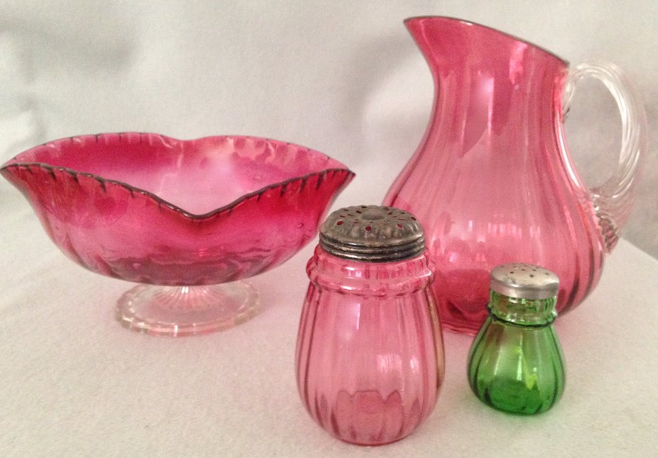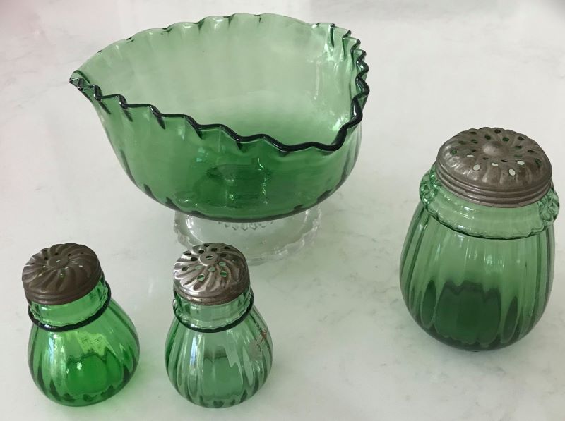 Contributor: Carole Linxwiler Bruce - Salt Shaker in the center is decorated. Also the Master Bowl is Tri-Cornered, not Square like the Catalog Reprint.