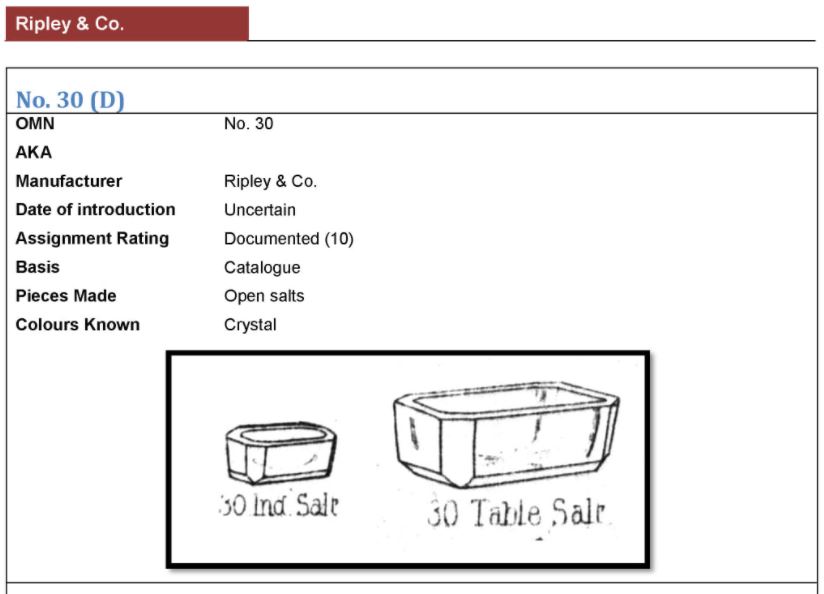NOTE: Sid Lethbridge 2020: These No. 30 open salts were part of the Ripley & Co. line. Date of introduction is uncertain.