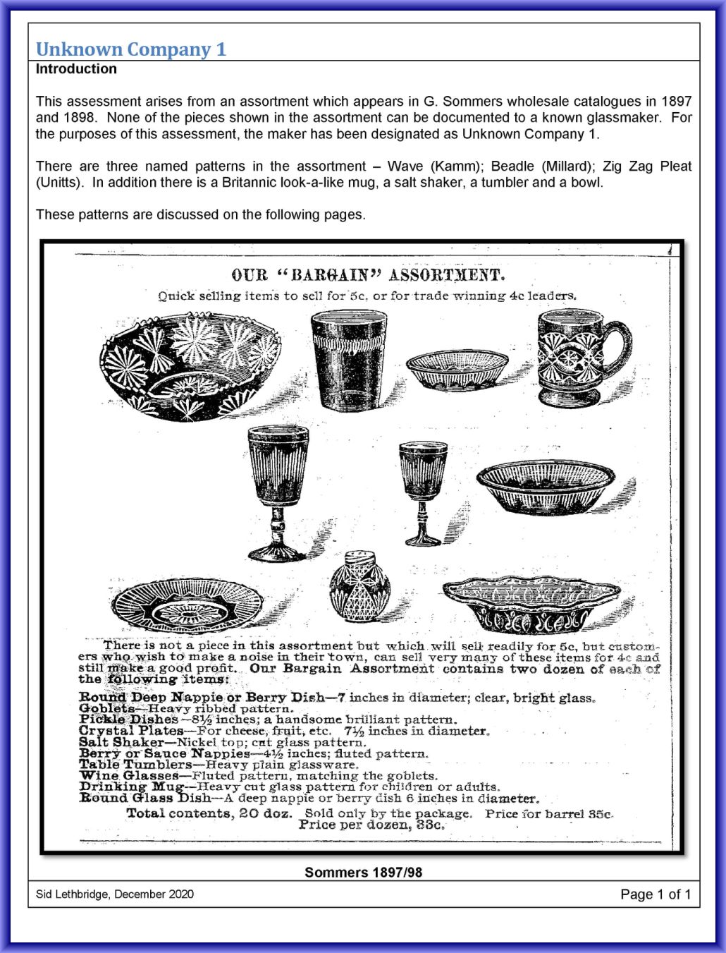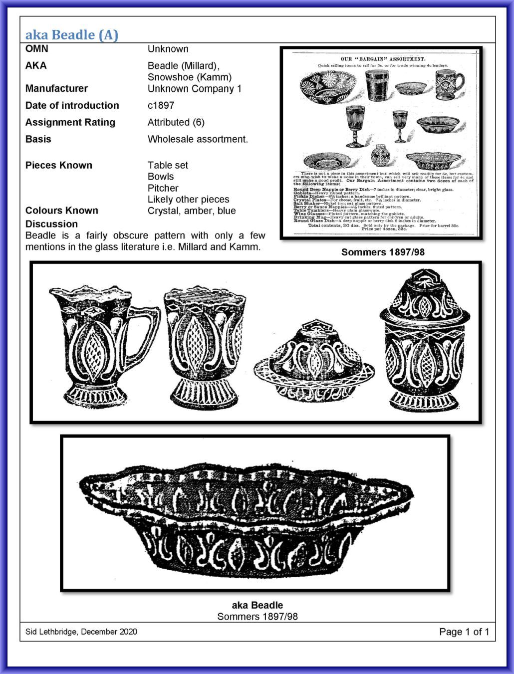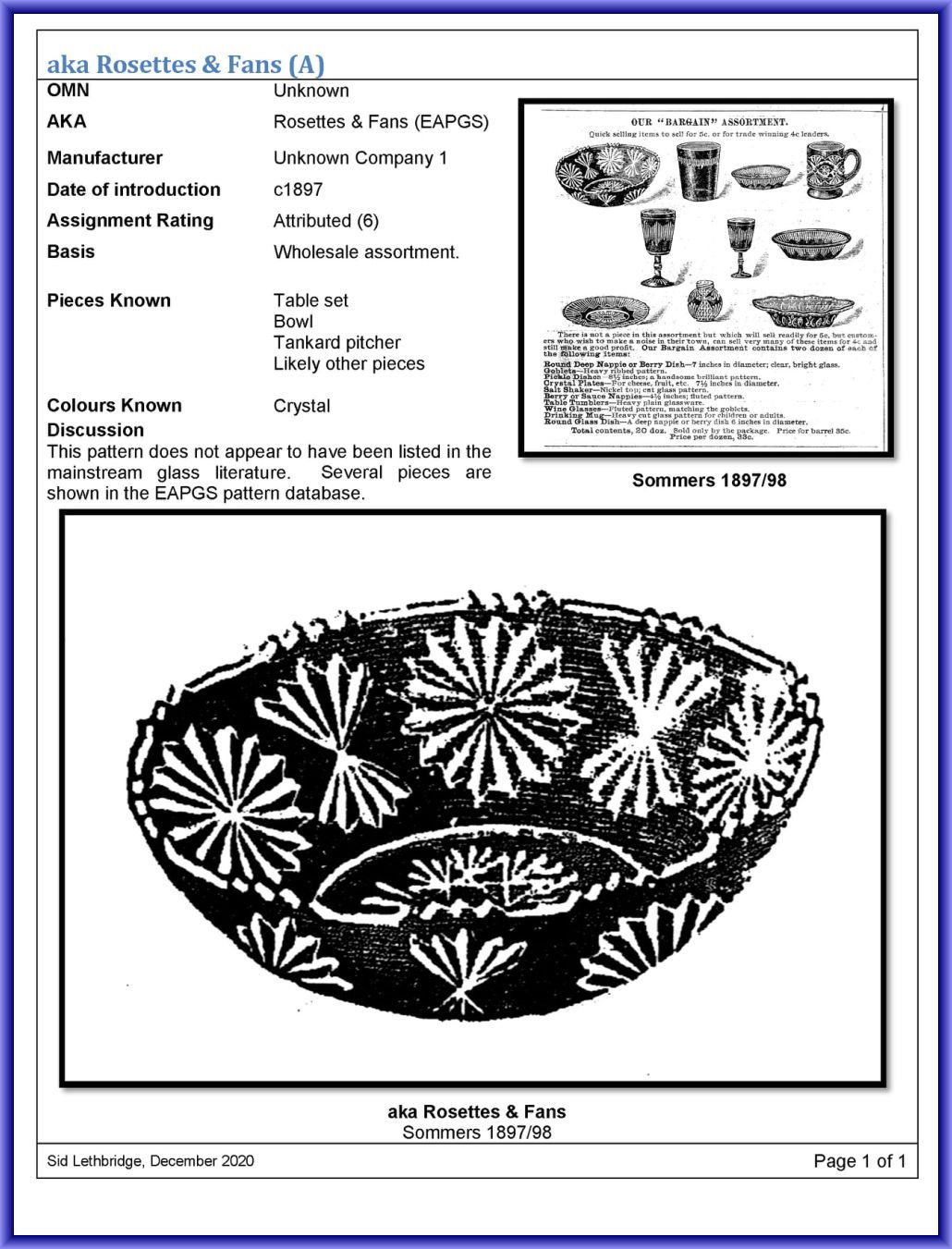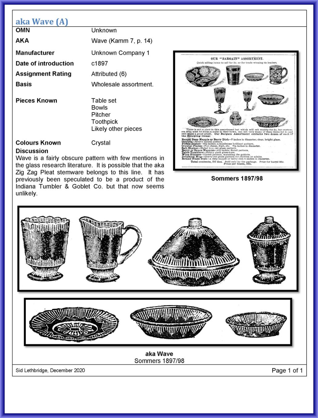 NOTE: Produced-Beadle (aka), Britannic Look-a-like Mug (aka), Rosettes and Fans (aka), Unnamed Salt Shaker (aka), Unnamed Tumbler (aka), Wave (aka), Zig Zag Pleat (aka) based on a wholesale catalog assortment.