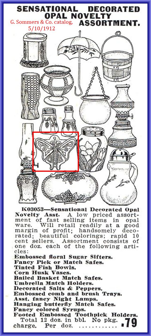 NOTE: Appears in wholesale assortments around 1911/12. Eagle Glass Co is considered a possible maker but no documentation is available.