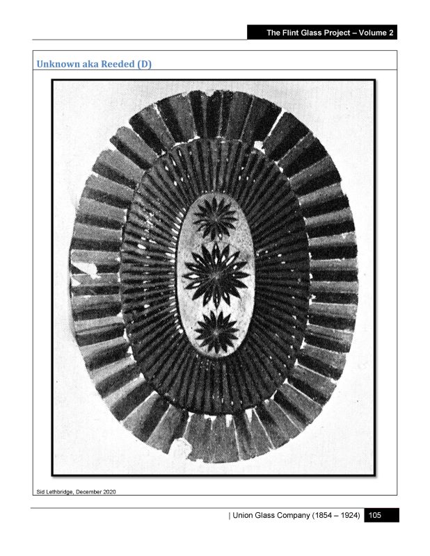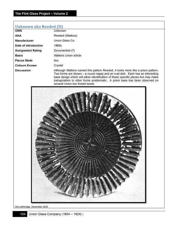 NOTE: Sid Lethbridge 2021: ..the Union Glass Co. patterns identified in the Lura Woodside Watkins' 1936 article on this company. She provided two photos of mould plaster casts in a pattern she called Reeded but which looks more like a prism pattern.
