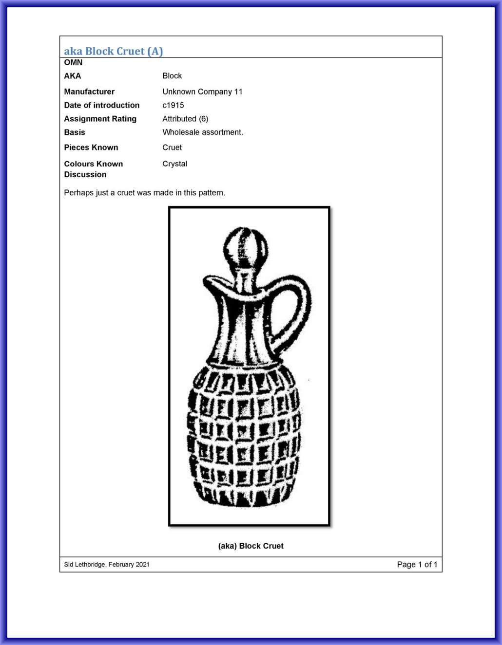 BLOCK CRUET (AKA)