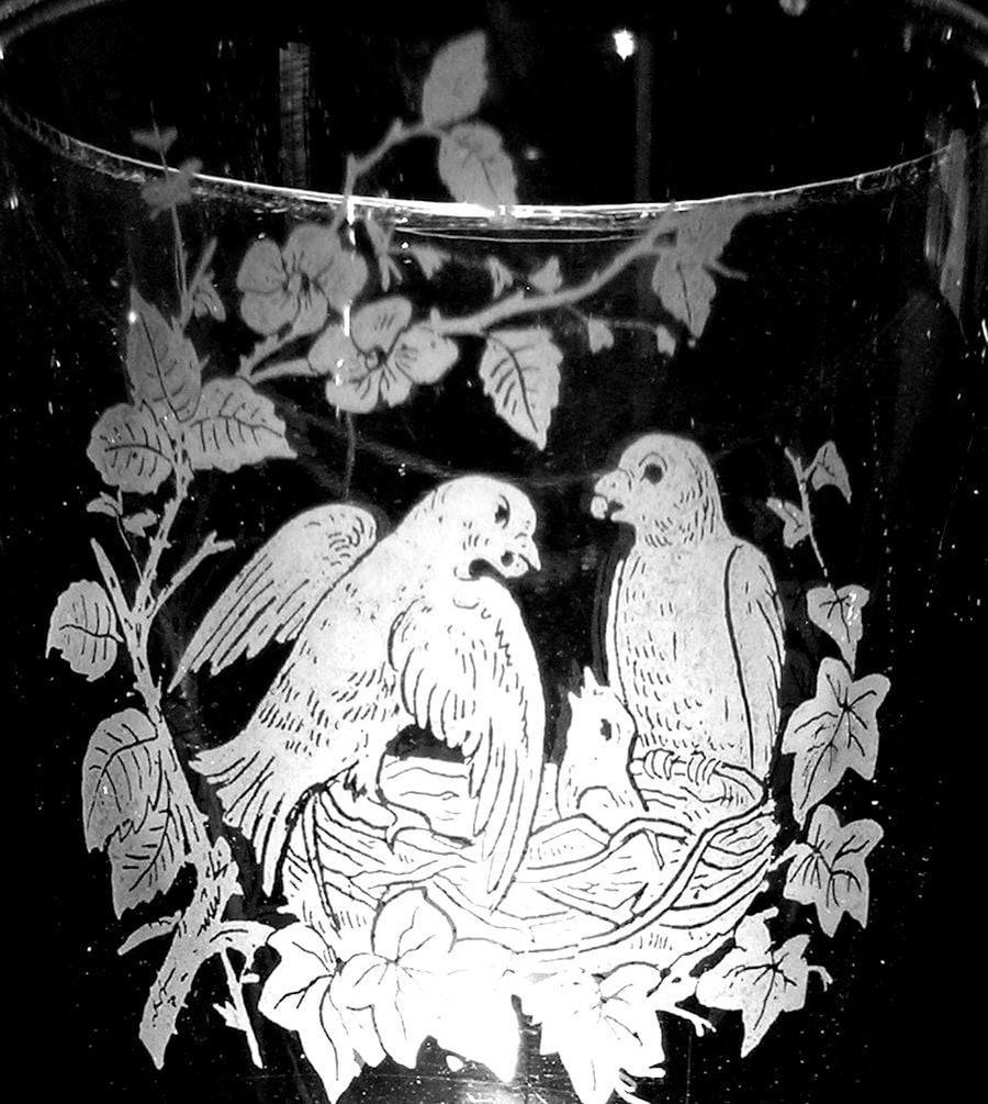 ETCHING: TWO BIRDS WITH NEST AND NESTLING (AKA) by Unknown Glass Company for Etchings No. 2/Unknown Location (Operated: Unknown), c1880s Introduced