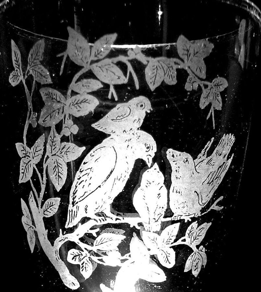 ETCHING: TWO BIRDS WITH NESTLINGS (AKA) by Unknown Glass Company for Etchings No. 2/Unknown Location (Operated: Unknown), c1880s Introduced