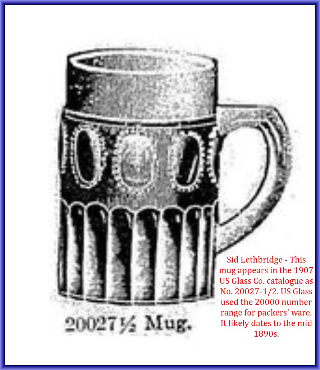 NOTE: Sid Lethbridge - This mug appears in the 1907 US Glass Co. catalogue as No. 20027-1/2. US Glass used the 20000 number range for packers' ware. It likely dates to the mid 1890s.