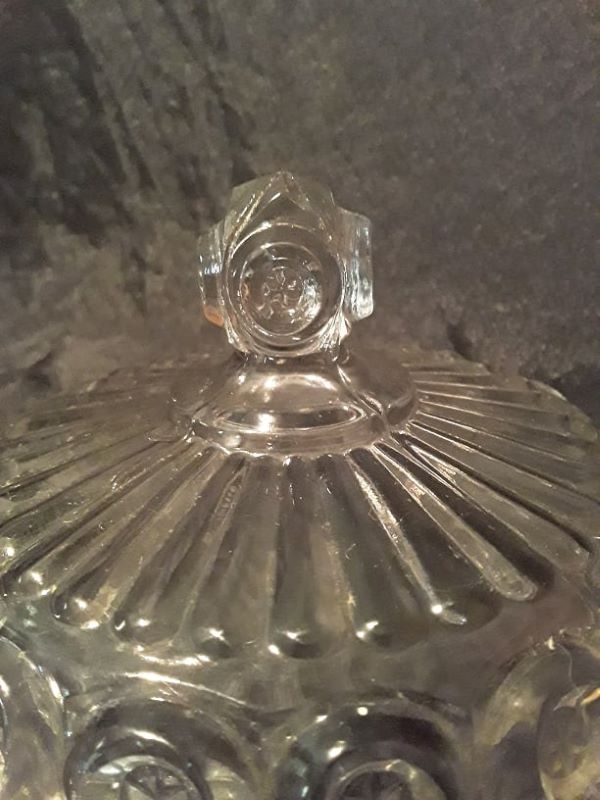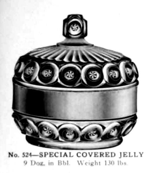 NOTE: Sid Lethbridge 2021: Note the star in the center of each bullseye. This is the No. 524 Special Covered Jelly which appears in a J B Higbee Glass Co. catalogue. After this firm failed in 1918, this went to New Martinsville who designated it as No. 524 Royal Special Jelly in their 1921 price list. In his book, Paul Kirk lays out a rationale for it being introduced by Bryce, Higbee in the mid-1890s. overall height 4.75H x 4.75D