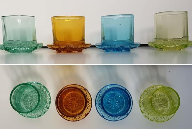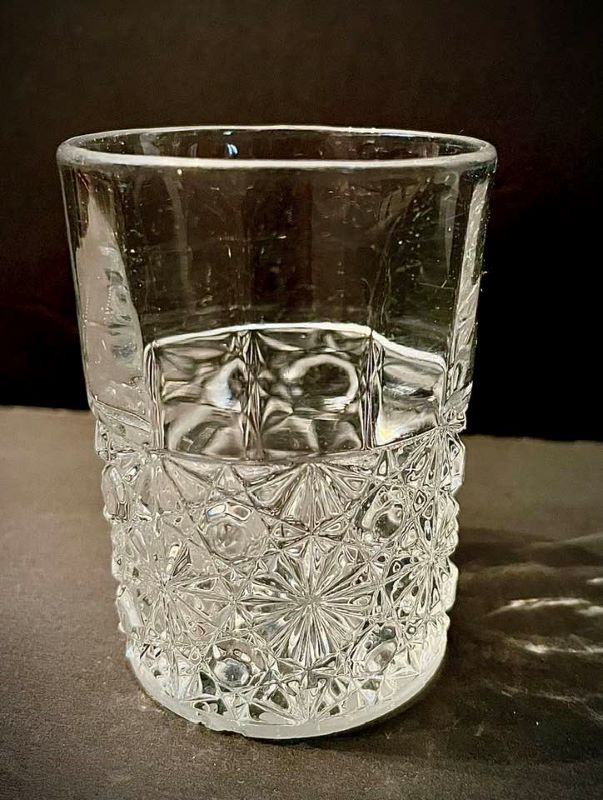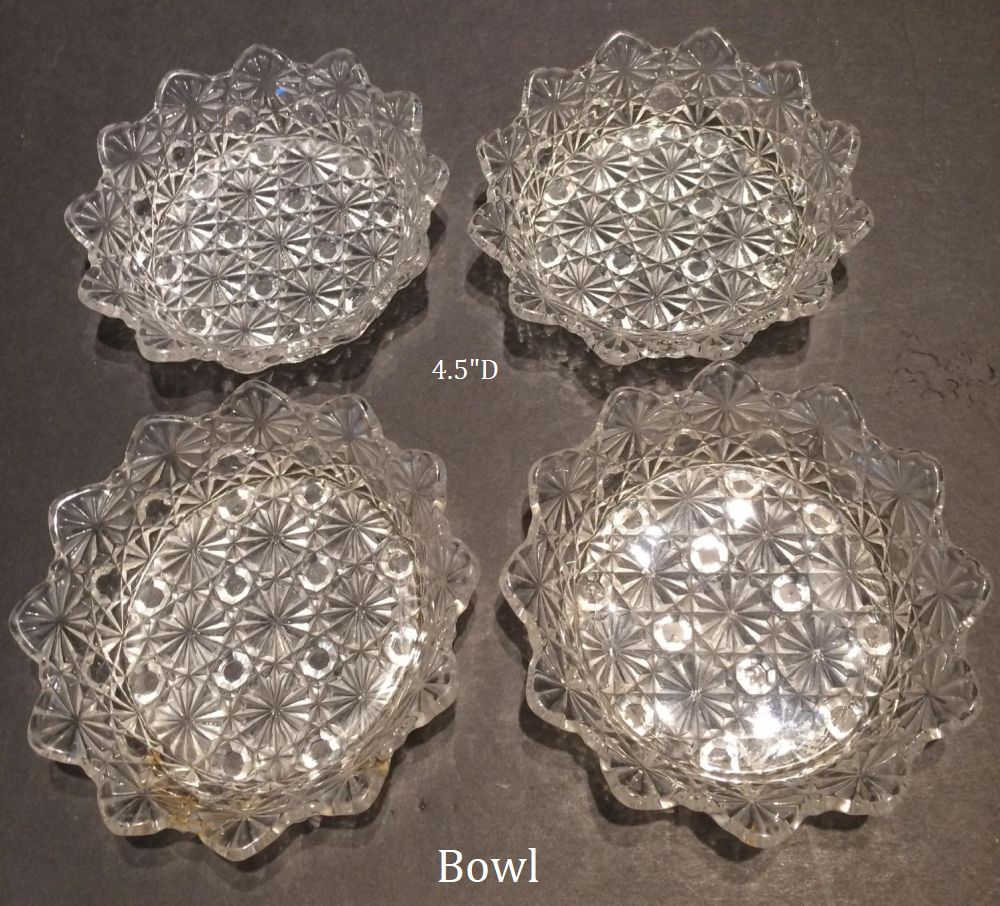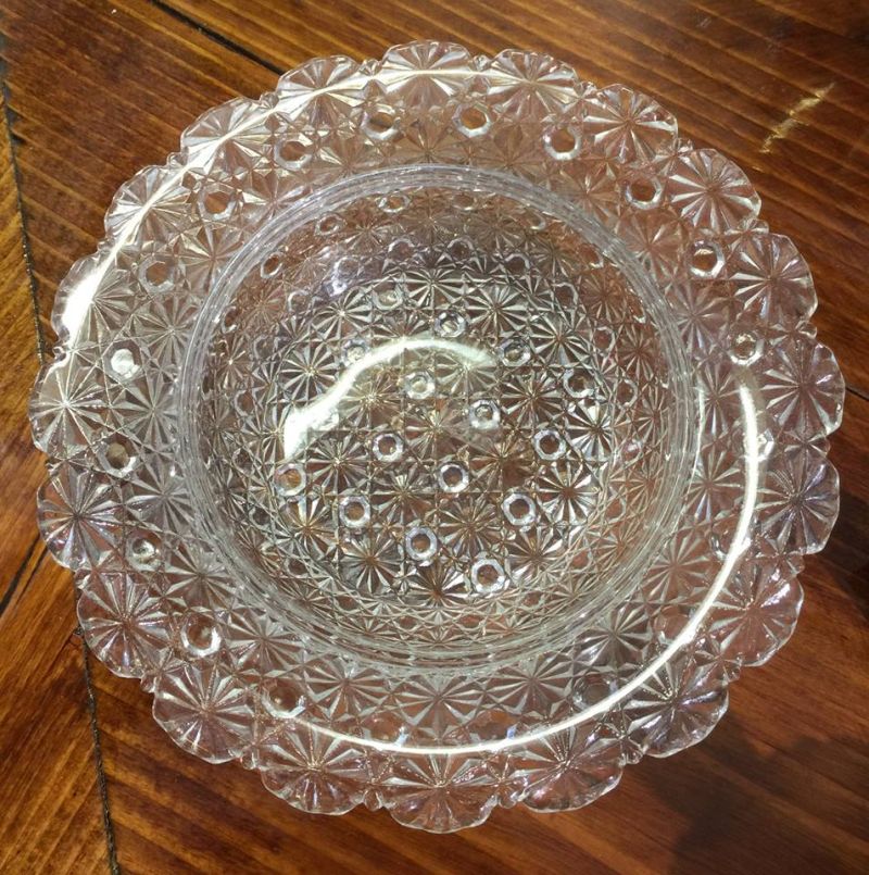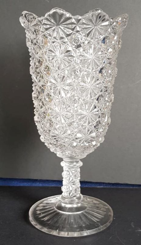 Contributor: Kathy Conn Turner - 3.75H, 2.38D at base, and 2.75D at rim. 11 optic panels inside. Base 20 pressed rays ground flat.