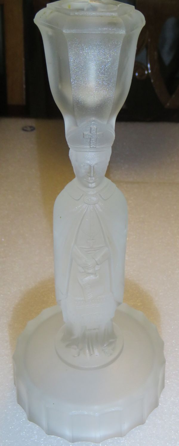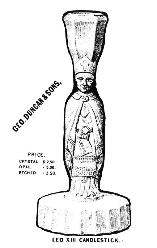 NOPTE: Sid Lethbridge 2021: George Duncan & Sons produced this LEO XIII Candlestick (OMN) c1886 (ref. Early Duncan Glassware).
