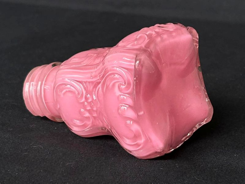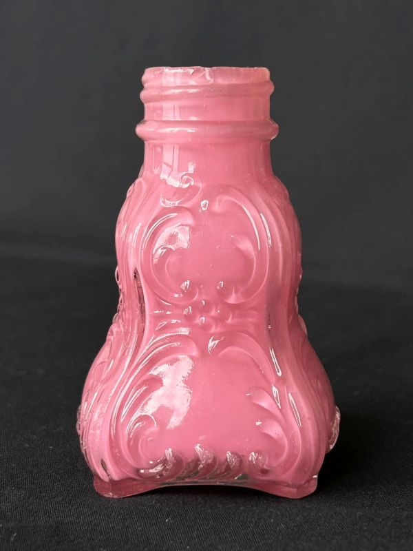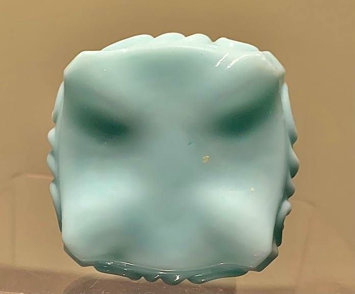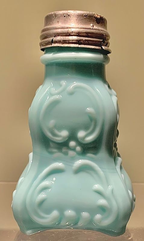 NOTE: Diane Dittman Hanson 2021: The footed one is named Scroll, Footed, p. 38 in Peterson’s 1000 Patterns book. Yours is a beautiful color and example that is not in the DB. References Millard’s Opaque Glass book on p. 166 too. This is also see on p 104 of The World of Salt Shakers, Mildred & Raph Lechner
