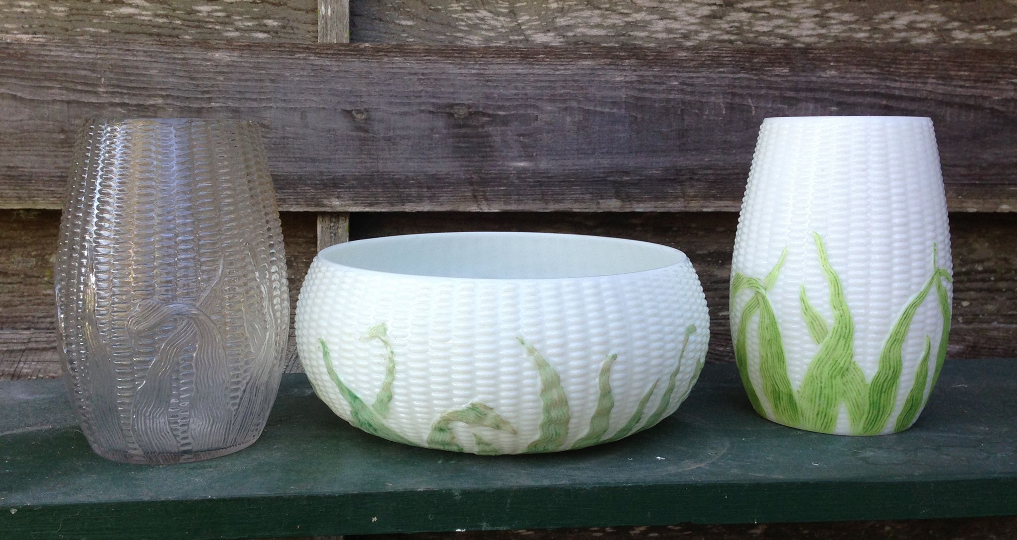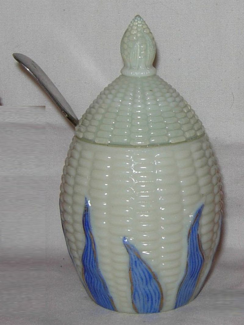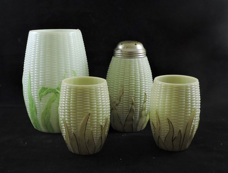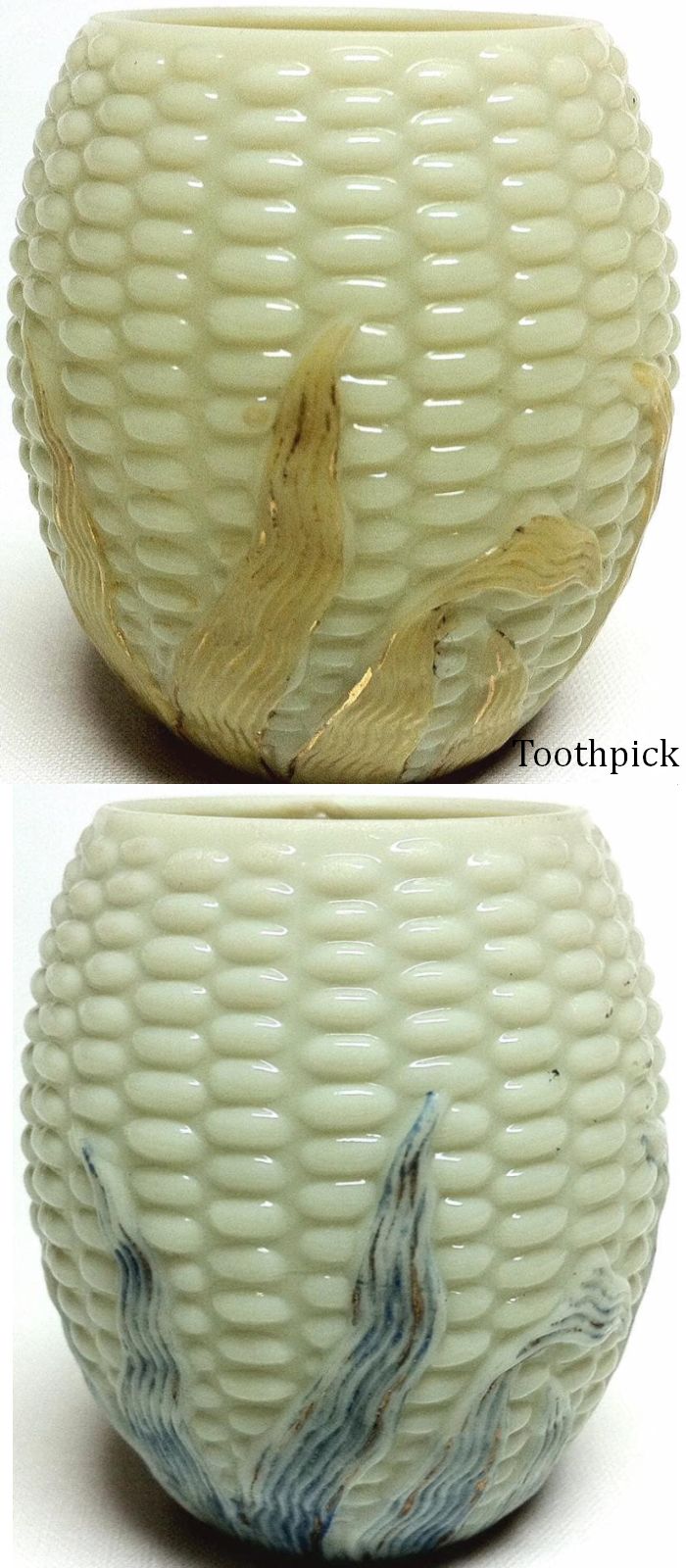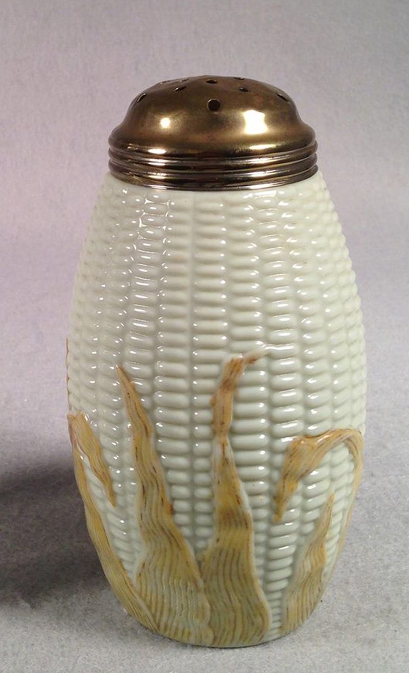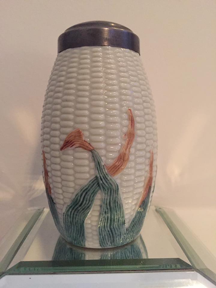 Contributor: Karen Welch 6.5" tall, 3.25" diameter at top rim, maximum diameter 4.25". Note touch of gilding along edges of custard-colored husks
