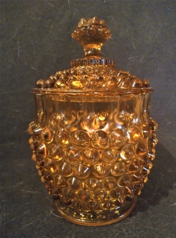Contributor: Rick Graham 8H including lid. note: Elson No. 90 Dew Drop molasses can. Unlike the rest of the pattern which has hobnails, the molasses can/syrup has an opalescent spot motif.
