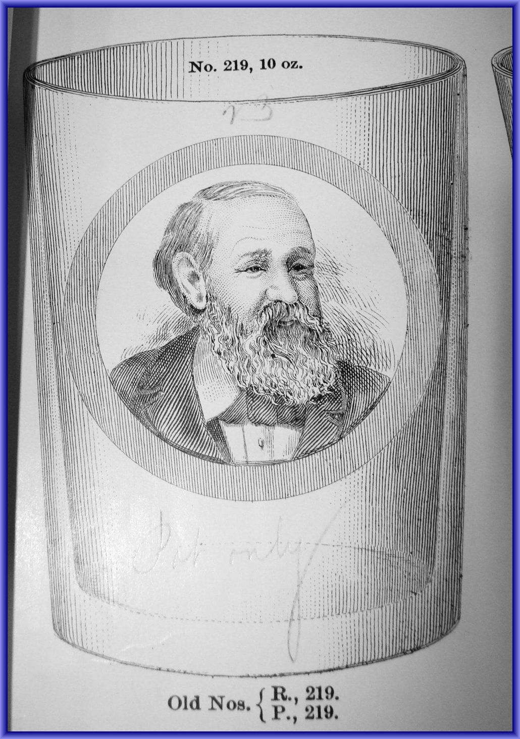 NOTE: Catalog cut from the 1893 US Glass Co. catalogue of pressed tumblers and beer mugs. The original names/numbers are below the tumbler and the new US Glass number is above it.