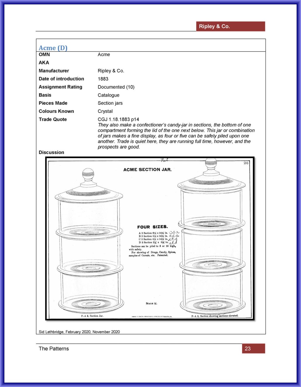 NOTE: Sid Lethbridge: …shown in an 1893 US Glass Packers' & Confectioners' Catalog as Acme Stacking Jars. They originated at the Ripley factory but were still being sold by US Glass in 1893.