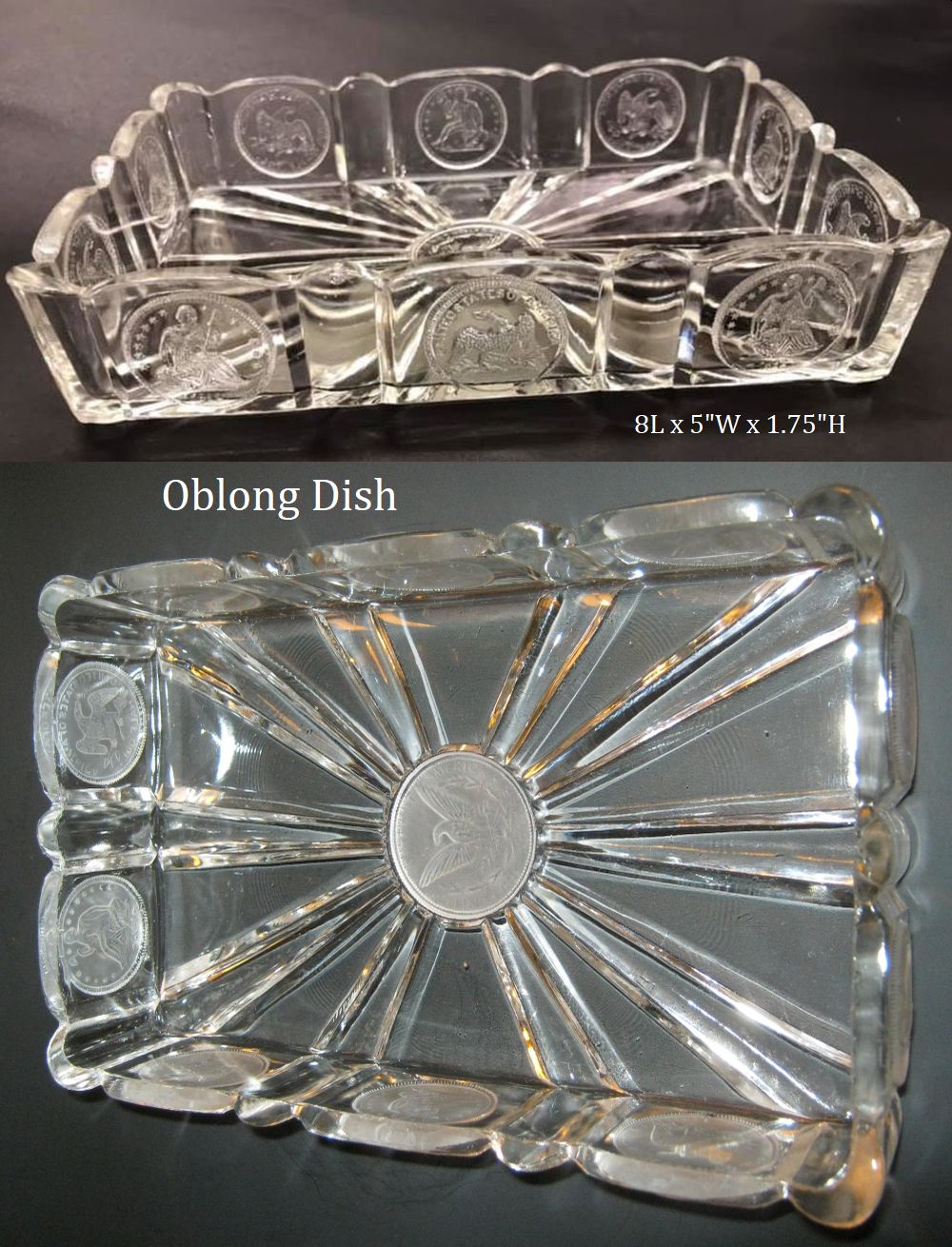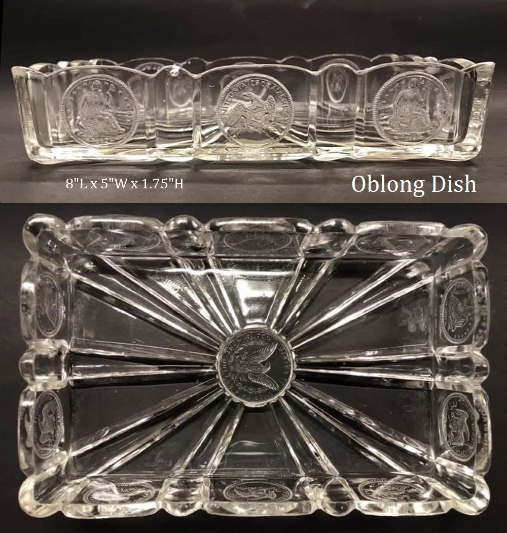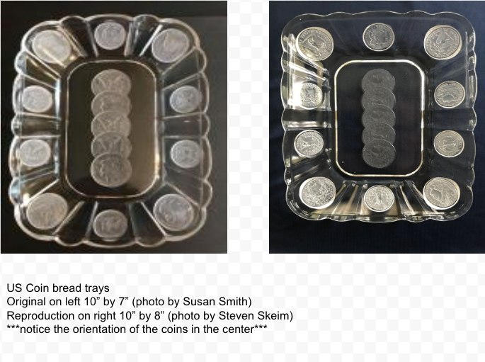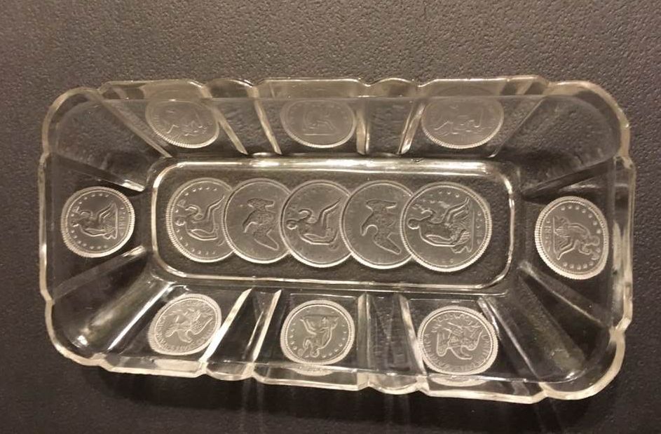 Contributor: Susan Smith 10L x 7W bread plate with 15 coins total and 5 Morgan dollars down center