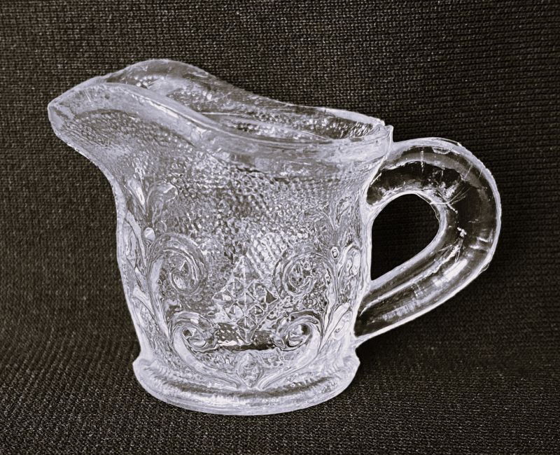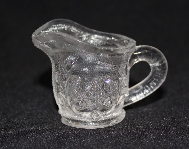 NOTE: Brady Fitts 2022: Clear Lacy Toy Jug (Pitcher) stands 1-5/8 to 1-3/4 inches high. It has three diamonds on each side with a scroll and lily. Generally found with a lacy basin. There are variations of a smaller spout and a scalloped rim. This Jug can be found in several colors. Refs: Barlow and Kaiser's ""A Guide to Sandwich Glass" Vol III Lacy Toys Number 3336b.