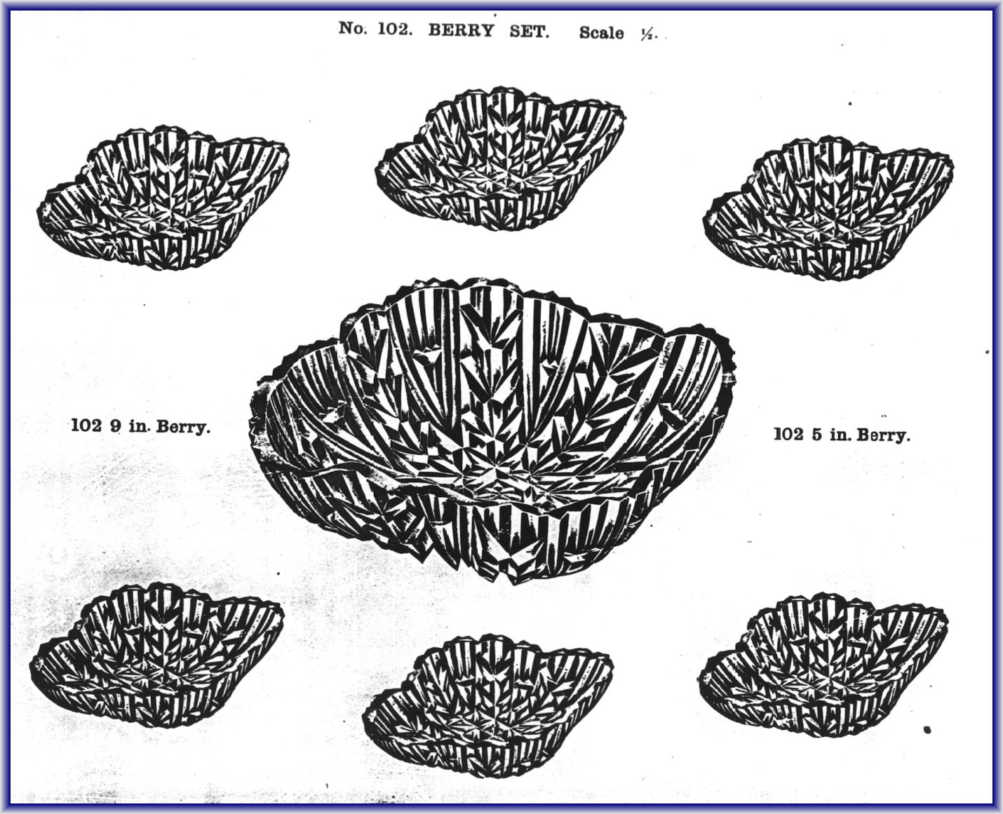NOTE: Sid Lethbridge - Pottery & glassware reporter, Jan. 15, 1891 "THE NICKEL PLATE GLASS COMPANY... exhibits a new line called 102, being a berry set of various shaped bowls in imitation of cut ware, the figure being a central star, interspersed with the square and mitre. Its strong point is the clear metal it is made of' and its refracting qualities. "