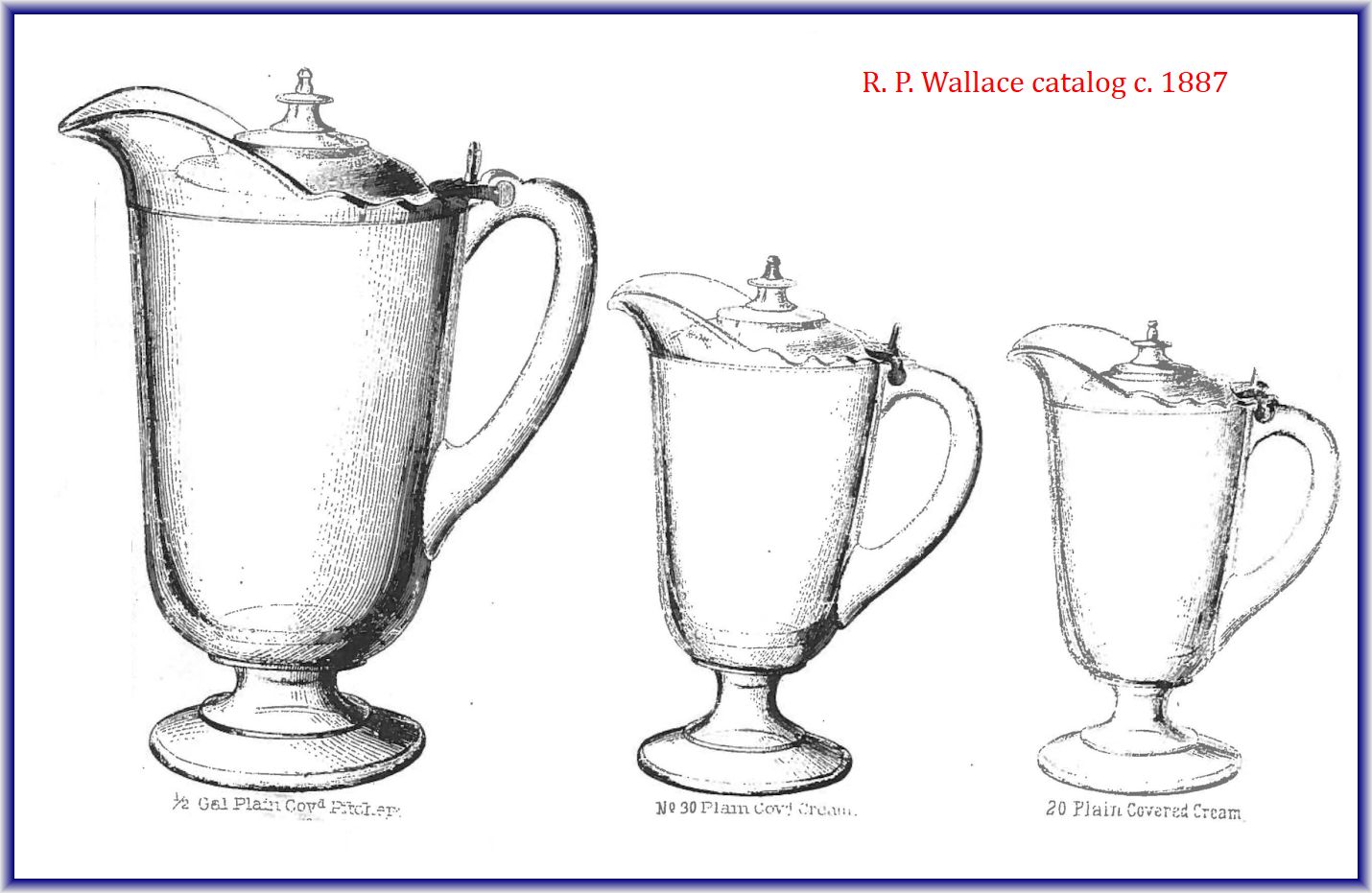 NOTE: Sid Lethbridge - They appear in a R P Wallace (wholesaler) catalogue dating to c1887. Plain is likely the OMN but the numbers used for the smaller pitchers are questionable as this wholesaler altered the OMNumber.