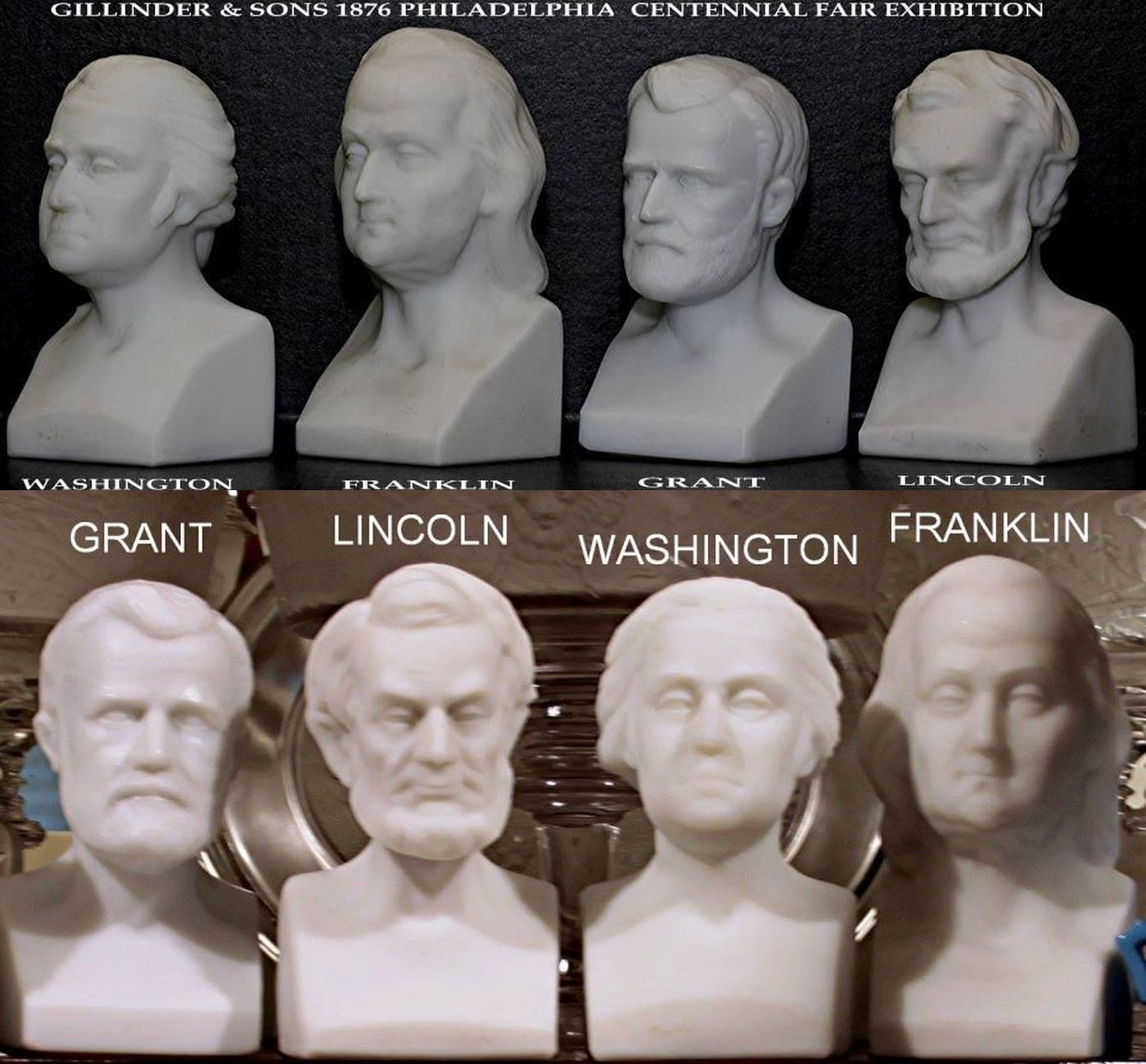 Contributor: Leonard Farchione - solid milk glass, each are 5lbs or better. embossed Gillinder & Sons on back, with names on each individual embossed on front