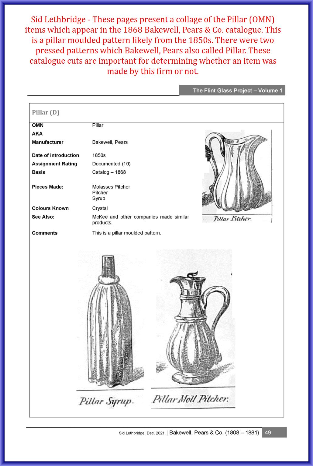 NOTE: Sid Leghbridge -Pillar (OMN) items which appear in the 1868 Bakewell, Pears & Co. catalogue. This is a pillar moulded pattern likely from the 1850s. There were two pressed patterns which Bakewell, Pears also called Pillar. These catalogue cuts are important for determining whether an item was made by this firm or not.