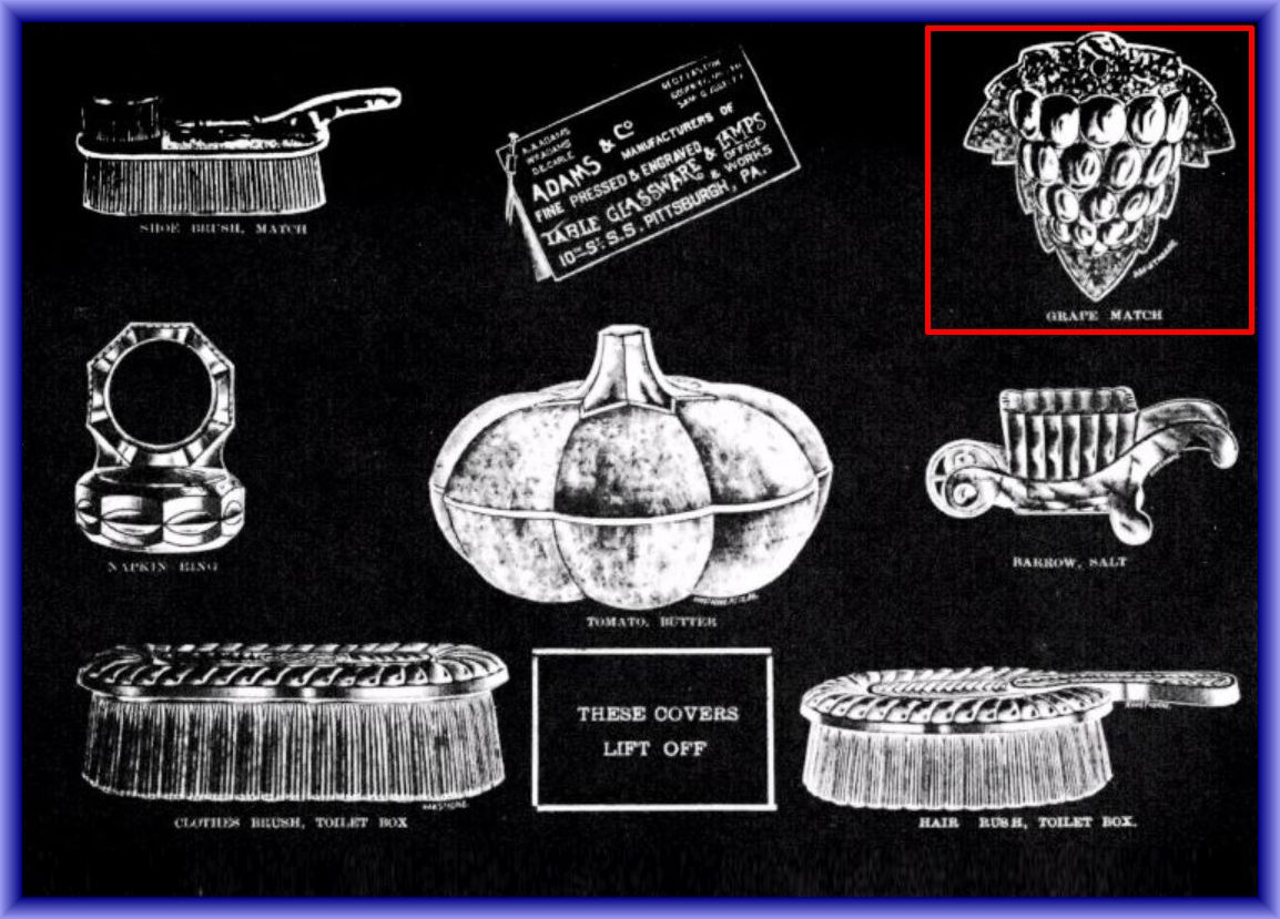 Note: Sid Lethbridge 2019: Yes it is Adams & Co. Grape Match (OMN). There is some controversy about this because of a page in a c1893 US Glass Co. Factory C catalogue which has a page almost identical to this Adams' advertisement. It is likely that US Glass moved production of these and other items like candlestick to Factory C.