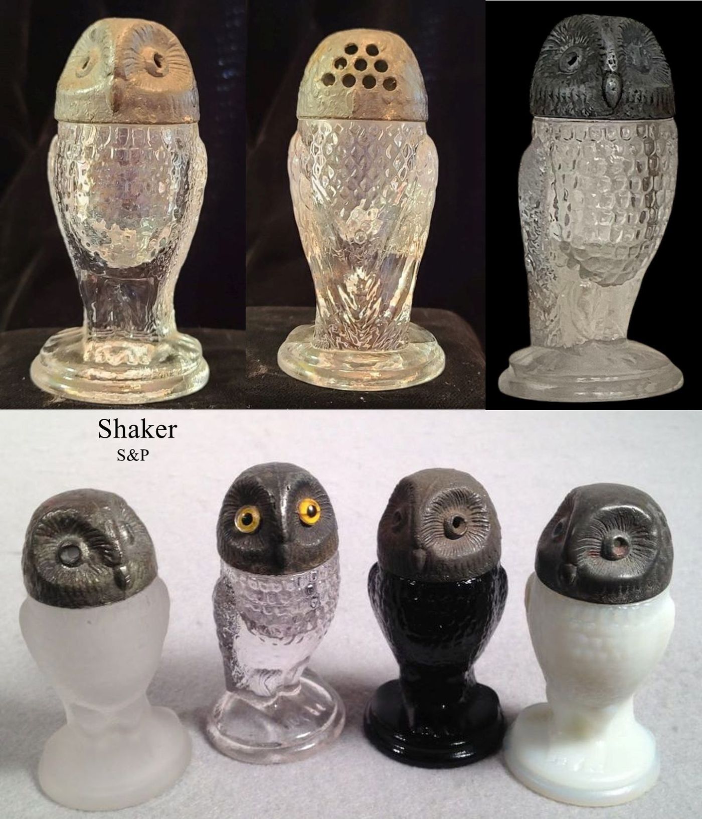 NOTE: 2022 - Peterson, Glass Salt Shakers, shows a picture of one on page 3, calling it Owl, Little. Page 55-56, patent drawing "Design Patent 9,744 to Harry P. Pears, February 1877". States this was the first design patent for a salt shaker. Assigned to Bakewell Pears.
