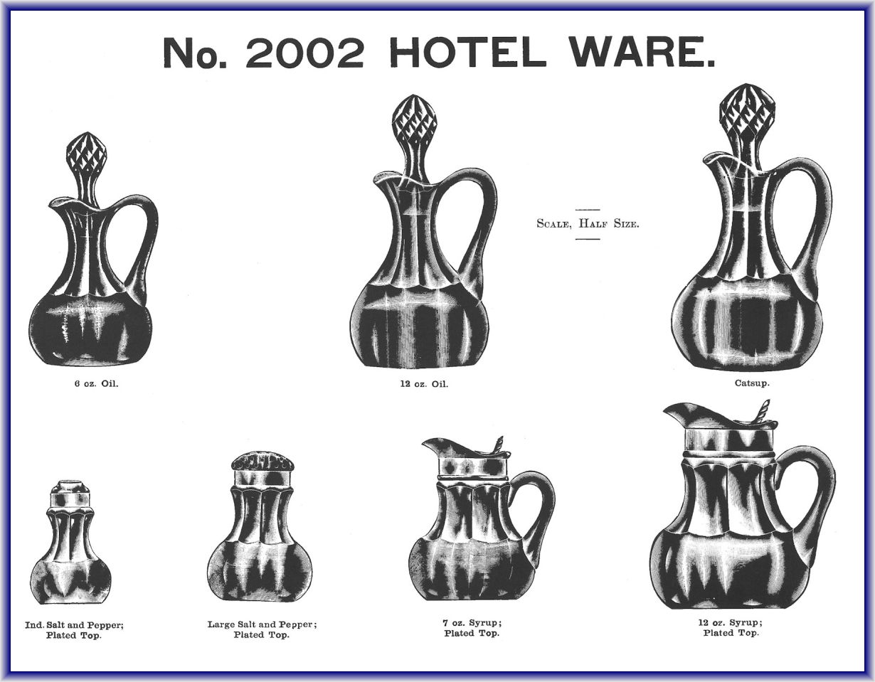 NOTE: No. 2002 Hotel Ware introduced in 1893. It is a short line of utilitarian plain ware meant for the hotel and restaurant trade. The line consists of oil cruets, catsup, syrups and salt shakers.
