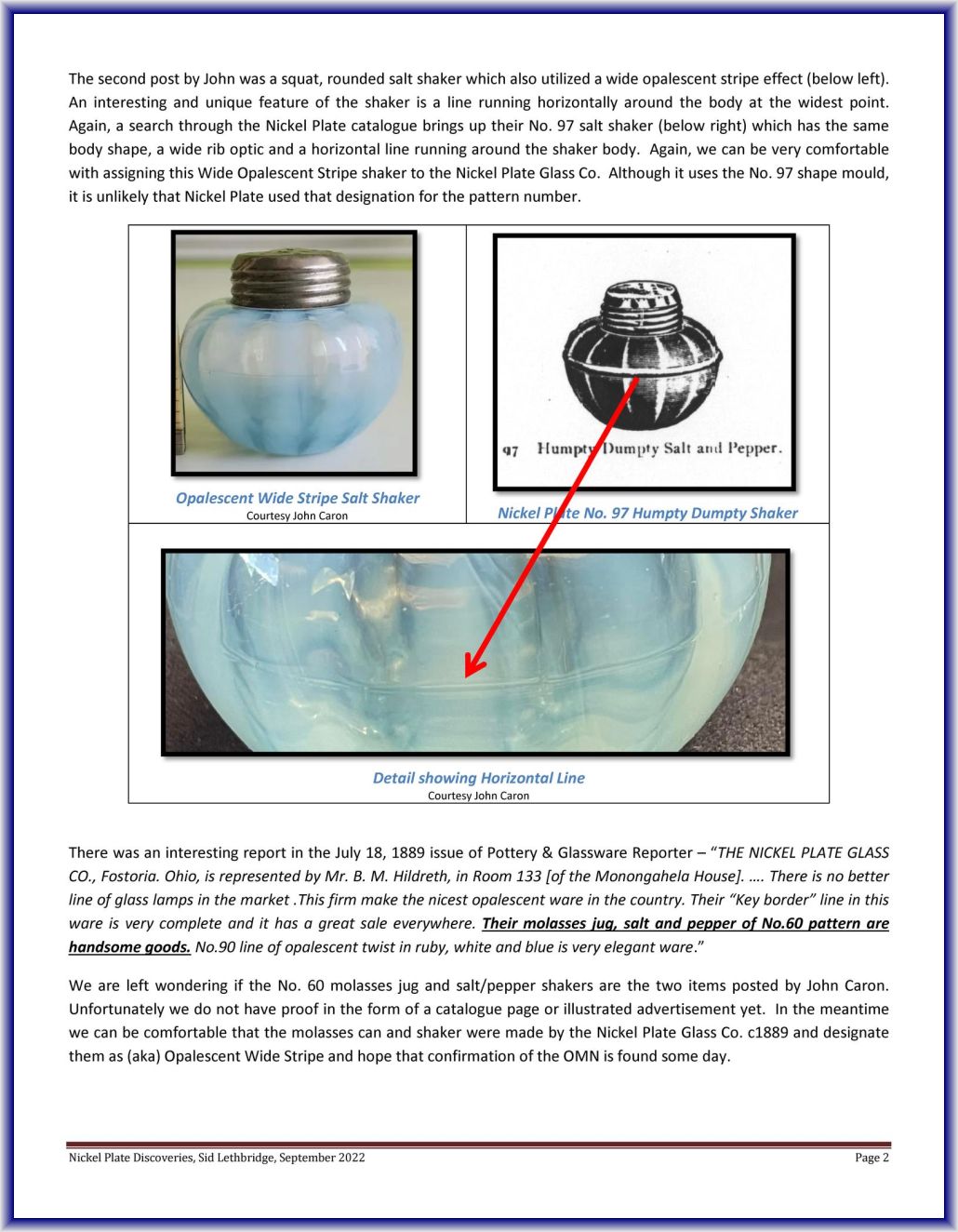 NOTE: Nickel Plate Glass Company used the shape molds for the No. 77 molasses can and the No. 97 salt; possibly the Nickel Plate No. 60 opalescent molasses can and salt and peppers mentioned in July 1889 as well.