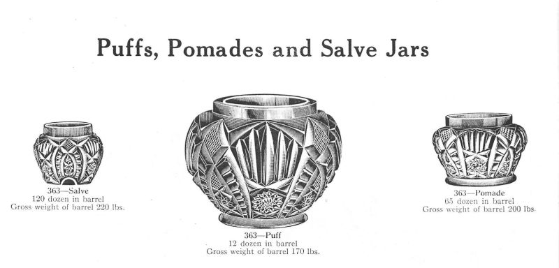 NOTE: Sid Lethbridge - This dresser line may be limited to a puff, salve and pomade. The puff could be a hair receiver or a puff jar depending on the lid.