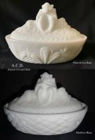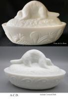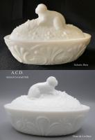 Notes: Research points to one unknown company making different but related patterns. We designate this company as Unknown Glass Company No. 29 in order to easily access and show their different but related works. Made many Animal Covered Dishes,(packing containers), speculated as used by EC Flaccus. Not signed. Connected to each other by the bases that are often mixed and matched.
