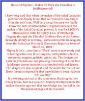 • NOTE: Sid Lethbridge: The Park (omn), (aka) Canadian pattern appears in an illustrated advertisement in the October 1883 issue of the Chicago Illuminator. The wholesaler called it the Park pattern which turns out to be the OMN. The Canadian pattern is a fairly extensive line and many of the various pieces can be found with two different sets of scenes! This is likely the reason that Ruth Webb Lee introduced some confusion when she stated that there were two patterns – (aka) Canadian and (aka) Cape Cod – with the same shapes but with the latter having water scenes and the former landscapes. There is agreement that there is just one pattern not two.