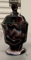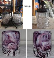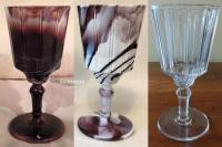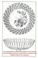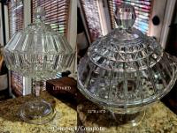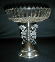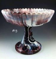 • NOTE: Brad Gougeon: I believe…that Challinor got the molds for the base from David Bennett at Crystal. Most of the ones that I have seen with the floral base and Challinor tops are quite worn, such as this blue one. When Challinor wanted to make this compote in milk glass, blue opaque, and purple mosaic, the design on the bottom would not show through so they had a new foot either made from scratch or retooled from the old mold. The new foot has a geometric design on the outside that can be easily seen.