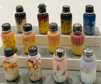 • NOTE: Sid Lethbridge - Catalogues show a cruet, shakers and a mustard. Clearly a toothpick was also made. They come in various effects - Burmese, Peach Blow, opal - and various decorations.