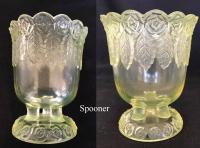 • NOTE: James Measell - I feel certain that the maker is likely National/McKee. I am inclined to date this in the late 1890s to 1903, because of the various pieces that occur in Chocolate glass, and the popularity of the canary glass color in the last few years of the 1890s and the early 20th century.