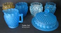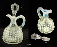 NOTE: Sid Lethbridge 2023: cruet is an Elson/West Virginia Glass Co. shape. I suspect it is an Elson No. 90 Dew Drop molasses can. Unlike the rest of the pattern which has hobnails, the molasses can/syrup has an opalescent spot motif.