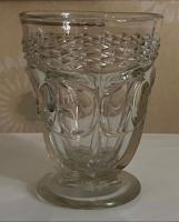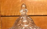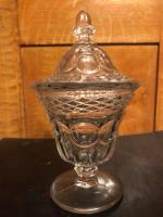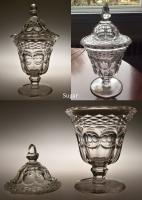 NOTE: Bob Burford 2023: sugar dimensions: (5-1/2"h x 4-5/8" od of mouth & 3-1/2"od foot), nine-paneled on short hex knopped stem from 3-part mold whose seams appear on plain foot.