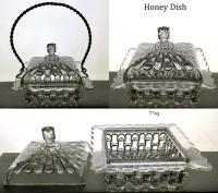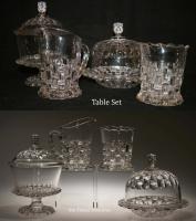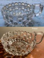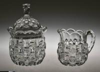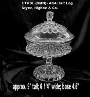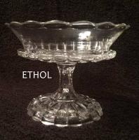 NOTE: Sid Lethbridge 2020: This pattern is sometimes confused with Westmoreland Specialty Co.'s No. 15 aka Bamboo Column. The cuts or notches are patterned on Ethol and plain on Westmoreland's No. 15 line. The sole exception to that rule is the No. 15 cruets which have the patterned notches. It has to be noted that no Ethol cruets appear in the thirteen known Bryce Higbee catalogue pages of the pattern. The shapes of the two patterns differ as well.