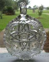 • ID by Kathy Conn Turner, Ref "Imperial Glass Company's NUCUT, Imitation Cut Glass Cast in Moulds". part of the Nucut line, made with and without Nucut hallmark, originally in crystal. Reissued in crystal, colors, and decorations. 4 1/2" excluding handle, company called it a handled olive.