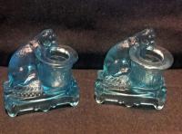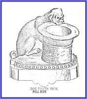 • NOTE: Sid Lethbridge - Has been reproduced. An example in any colour other than crystal, frosted, amber, blue or canary is a reproduction. The interior of the hat in the originals is straight and runs parallel to the exterior. On the reproductions, the interior of the hat slopes inwards. On the reproductions, between the hat and the dog's tail, the beaded platform on which the hat and dog are seated has two scallops.
