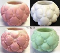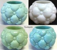 • NOTE: Sid Lethbridge 2020: QUILT TOOTHPICK shares a design motif with Nos 29 and 30 shakers, the No 77 toothpick, and the later pattern FLORETTE. came in solid colors only. FLORETTE was made in mauve (cased pink) and crystal only; No. 77 cased only.