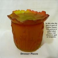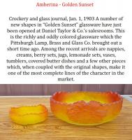 • NOTE: Brad Gougeon 2020: "Crockery and glass journal, Apr. 2, 1903:“Golden Sunset” and “Edgewood” glassware continue to win substantial business for the Pittsburgh Lamp and Brass Co. represented at Daniel Taylor & Co.’s warerooms. The first named is treated in colors that are designed to represent, as the name implies, a golden sunset...there are four-piece table sets, water sets, berry sets and fancy pieces."