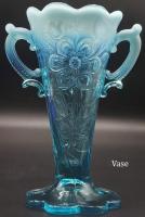 • NOTE: Bill Banks 2020: usually found in carnival colors but made in blue, white opalescent in 1914 only. 3 shapes found: "one... is a three handled "Loving Cup" with no scallops at the top or around the foot. It has never been found in Opalescent colors. A second shape has two handles with 8 scallops at the top and around the foot and is the one shown here. It has never been reproduced and is very rare to find. It is listed in a Butler Brothers catalog shown dated 1914." Third shape is a Mosser repro with 10 scallops around rim , 2 handles.