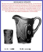 • NOTE: The pattern appears with a buzz star (inside the parenthesis). The pattern that does not have the buzz star (inside the parenthesis) is a later retooled version. Around the middle of 1927, the United States Glass Co. introduced No. 15338 (also designated as No. 338) which was made in modified No. 15104 moulds.