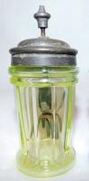 • NOTE: Sid Lethbridge 2020: sold by Alden... they shopped out the production to various glass makers. They advertised that the Hobbs Glass Co. made ruby for them. It is likely that they had multiple moulds because they sold a lot of these shakers over the years. That would suggest that the blue example may also be a Family shaker with a minor variation in the size of the ribs.