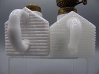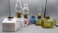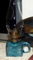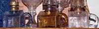 NOTE: Leonard Farchione: 2023: Atterbury school hous or log cabin oil lamps, two sizes, larger 4 inches to the top of the brass collar, smaller at 3 1/2 inches. many different colors, shades of amber, blue, milk glass and others. from my observations some perfect, many on the crude side with alot of annealing lines, sloppy applied handles, some with a very visible patent date sept. 3 1868. located at the underside of the cabin. some dates very very faint, some not visible at all.