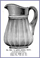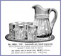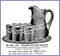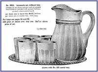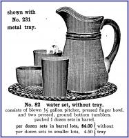 • NOTE: Sid Lethbridge - No. 82 blown pitchers and water and lemonade sets. It was available plain or with an optic effect (designated A). The water set consisted of a pitcher, two tumblers and a finger bowl and an optional metal tray. The lemonade sets were made up of a pitcher, six tumblers and an optional metal tray. This pattern was introduced in 1904. The images are from the 1909 Imperial catalogue but the pitcher appears in the 1904 price list.