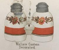 • NOTE: Sid Lethbridge 2024 - The shaker set appears in a c1887 R P Wallace wholesale catalogue as the Wallace Caster. This would predate the formation of the Consolidated Glass Lamp & Glass Co. (1893) and its predecessor Fostoria Shade & Lamp Co. (1890) so they can be taken off the list of possible makers. The aka for the shakers is Distended Sides which apparently came from Milk Glass Addenda by Edwin Warman.
