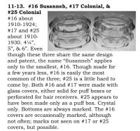 No. 16 aka Betsy Ross Hair Receiver (Vogel); No. 16 aka Susanneh Hair Receiver (Tankesley-Clarke); No. 17 puff box (Vogel); No. 25 aka Martha Washington puff box (Vogel)